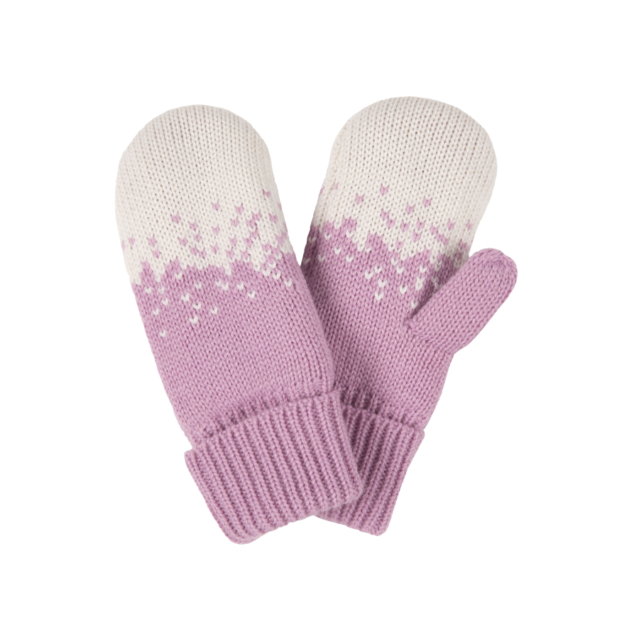 *Состав ткани: верхняя ткань – 50% Шерсть, 50% Акрил; подкладка 100% Полиэстер *Теплые варежки двойной вязки на флисовой подкладке *Цвет очень бледный фиолетовый, белый