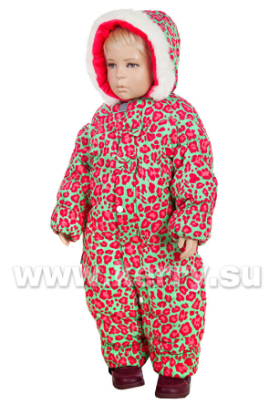 Комбинезон утеплен толстым слоем "KERRYFILL" (это утеплитель нового поколения), подкладка хлопок. Модель застегивается на молнию, которая защищена ветрозащитной планкой, украшенной бантиками. Капюшон с утеплителем, на резинке, опушка искусственный мех. Отделка капюшона - велюр. На спинке на талии резинка. Имеются светоотражающие элементы. На рукавах и брюках есть отвороты. Низ брюк на резинке, со штрипками.