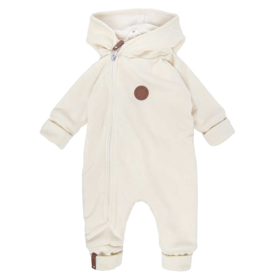 *Состав ткани: верхняя ткань – 100% Мериносовая шерсть; подкладка – 80% Хлопок, 20% Полиэстер *Трикотажный комбинезон для новорожденных *Подкладка - хлопковый мех *Модель застегивается на молнию *Рукава и низ брючин с отворотами *Цвет молочный