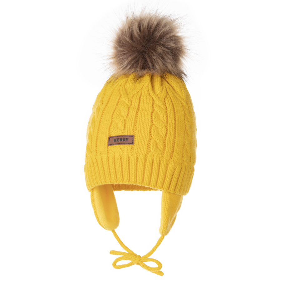 *Состав ткани: верхняя ткань – 100 % Акрил; подкладка 100 % Полиэстер *Теплая шапка объемной вязки на флисовой подкладке, с завязками, со съемным помпоном из искусственного меха *Цвет ярко-желтый