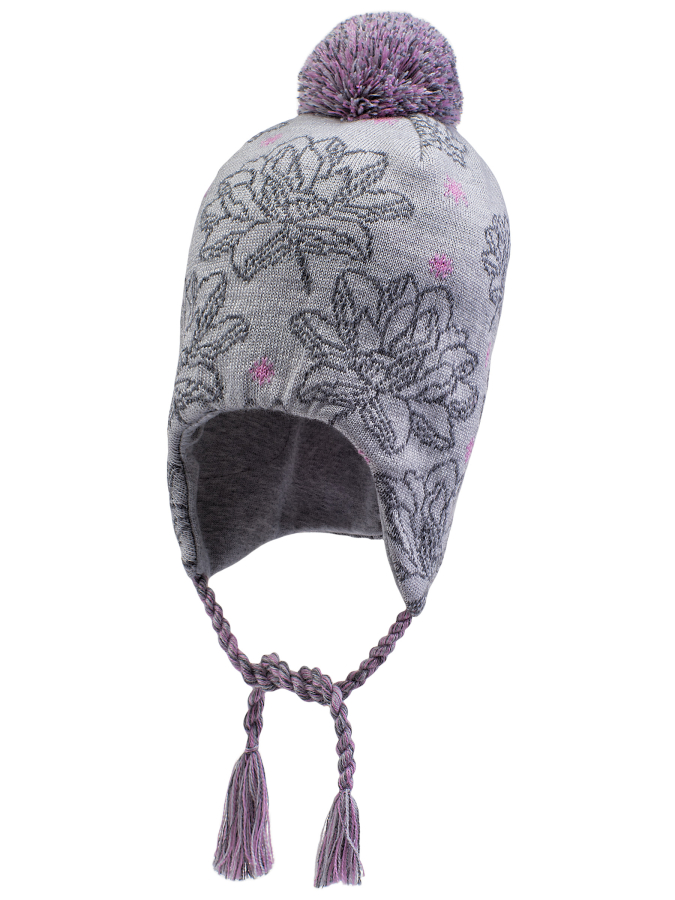 *Состав ткани: верхняя ткань – 50% Шерсть, 50% Акрил; подкладка 97% Хлопок, 3% Эластан *Теплая шапка двойной вязки на завязках *Подкладка - плотный хлопковый трикотаж *В области ушей имеется ветрозащитная мембрана *Цвет серый-металлик, бледно-розовый