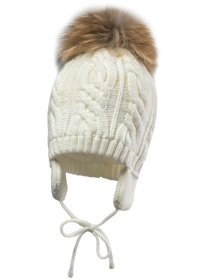 *Состав ткани: верхняя ткань – 50% Шерсть, 50% Акрил; подкладка 100% Полиэстер *Теплая шапка объемной вязки на завязках, с помпоном из натурального меха *Помпон съемный, пристегивается на кнопку *Подкладка - флис *Цвет молочный