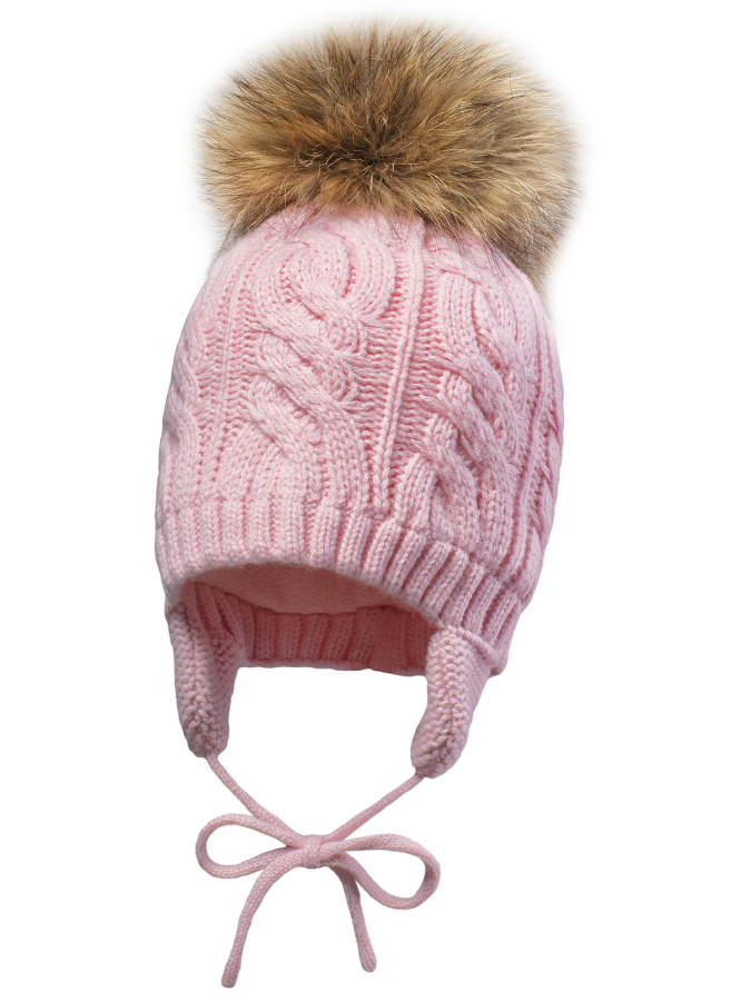 *Состав ткани: верхняя ткань – 50% Шерсть, 50% Акрил; подкладка 100% Полиэстер *Теплая шапка объемной вязки на завязках, с помпоном из натурального меха *Помпон съемный, пристегивается на кнопку *Подкладка - флис *Цвет розовый