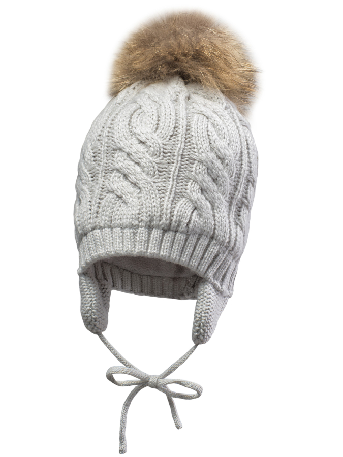 *Состав ткани: верхняя ткань – 50% Шерсть, 50% Акрил; подкладка 100% Полиэстер *Теплая шапка объемной вязки на завязках, с помпоном из натурального меха *Помпон съемный, пристегивается на кнопку *Подкладка - флис *Цвет серый