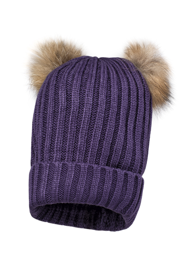 *Состав ткани: верхняя ткань – 100% Акрил; подкладка 100% Полиэстер *Теплая шапка объемной вязки, с помпонами из натурального меха *Помпоны съемные, пристегиваются на кнопку *Подкладка - флис *Цвет серовато-фиолетовый