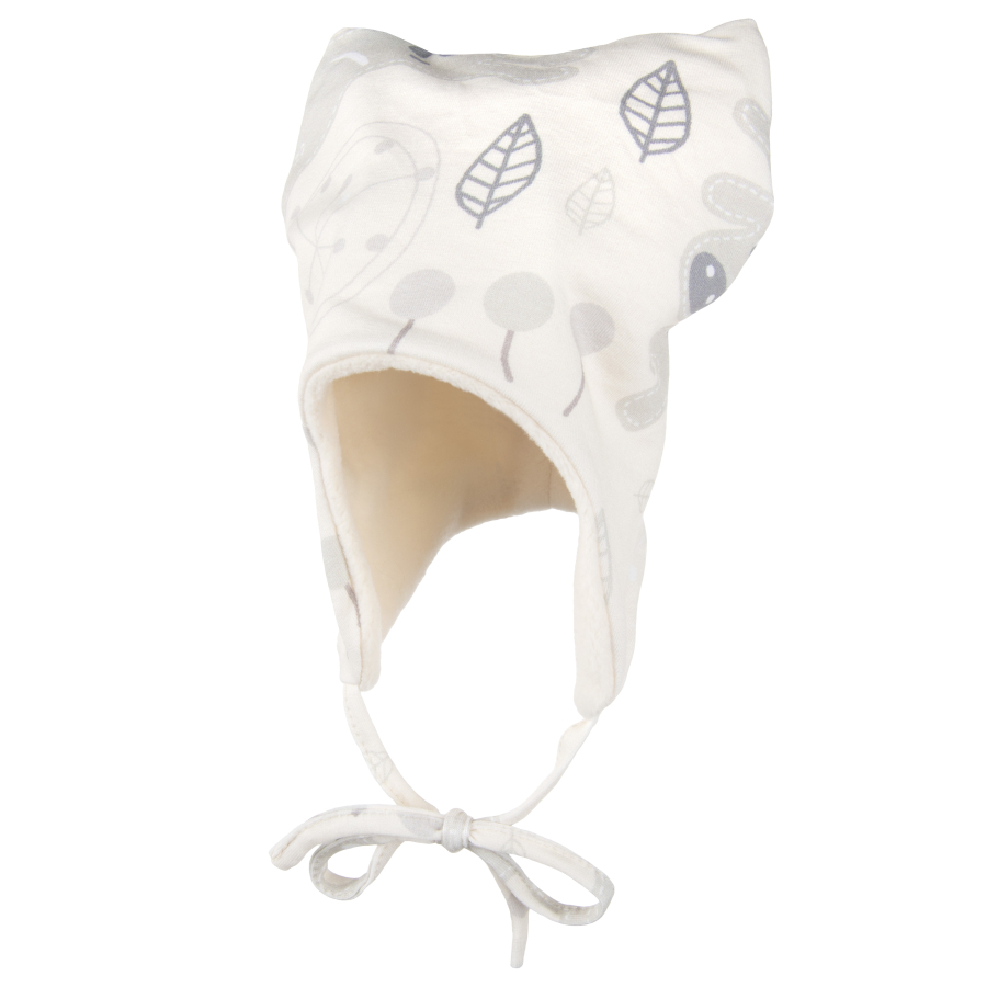 *Состав ткани: верхняя ткань – 92% хлопок, 8% эластан; подкладка 80% Хлопок, 20% Полиэстер *Теплая трикотажная шапка на флисовой подкладке из хлопка, на завязках *Цвет молочный