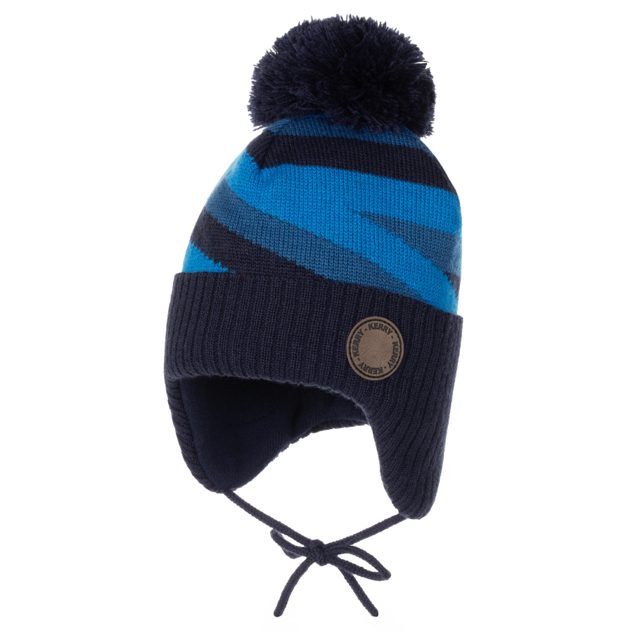*Состав ткани: верхняя ткань – 50 % Шерсть, 50 % Акрил; подкладка – 100 % Органический хлопок *Теплая шапка двойной вязки, с отворотом, на завязках, с помпоном *В области ушей имеется ветрозащитная мембрана *Подкладка - плотный хлопковый трикотаж *Цвет синий, лазурно-серый, темно-синий