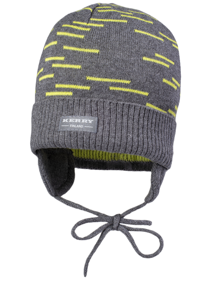*Состав ткани: 100% Органический хлопок *Демисезонная шапка двойной вязки, без подкладки, с завязками *Цвет темно-серый, желто-зеленый