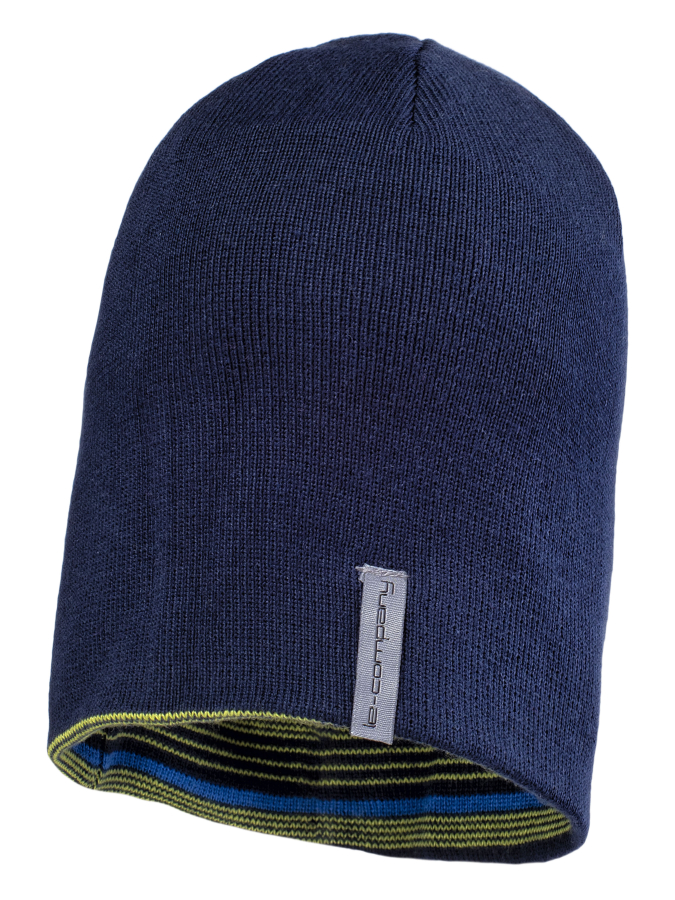 *Состав ткани – верх: 100 % Органический хлопок; подкладка : 100 % Органический хлопок *Теплая демисезонная шапка плотной вязки, двухсторонняя *Цвет темно-синий, синий, желто-зеленый